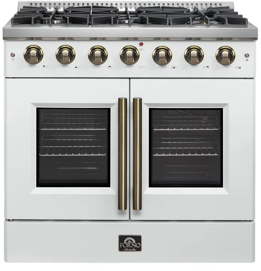 The Forno Galiano 36" French Door Gas Range in white brings professional styling and performance into your home kitchen at an affordable price. Enjoy effortless access to your oven with French doors that offer an extra 12 inches of space. The cooking surface has six sealed burners with a total output of 83,000 BTU - one of which is a 20,000 BTU dual-ring burner that can reach a precise simmer of 1,000 BTU.Read More