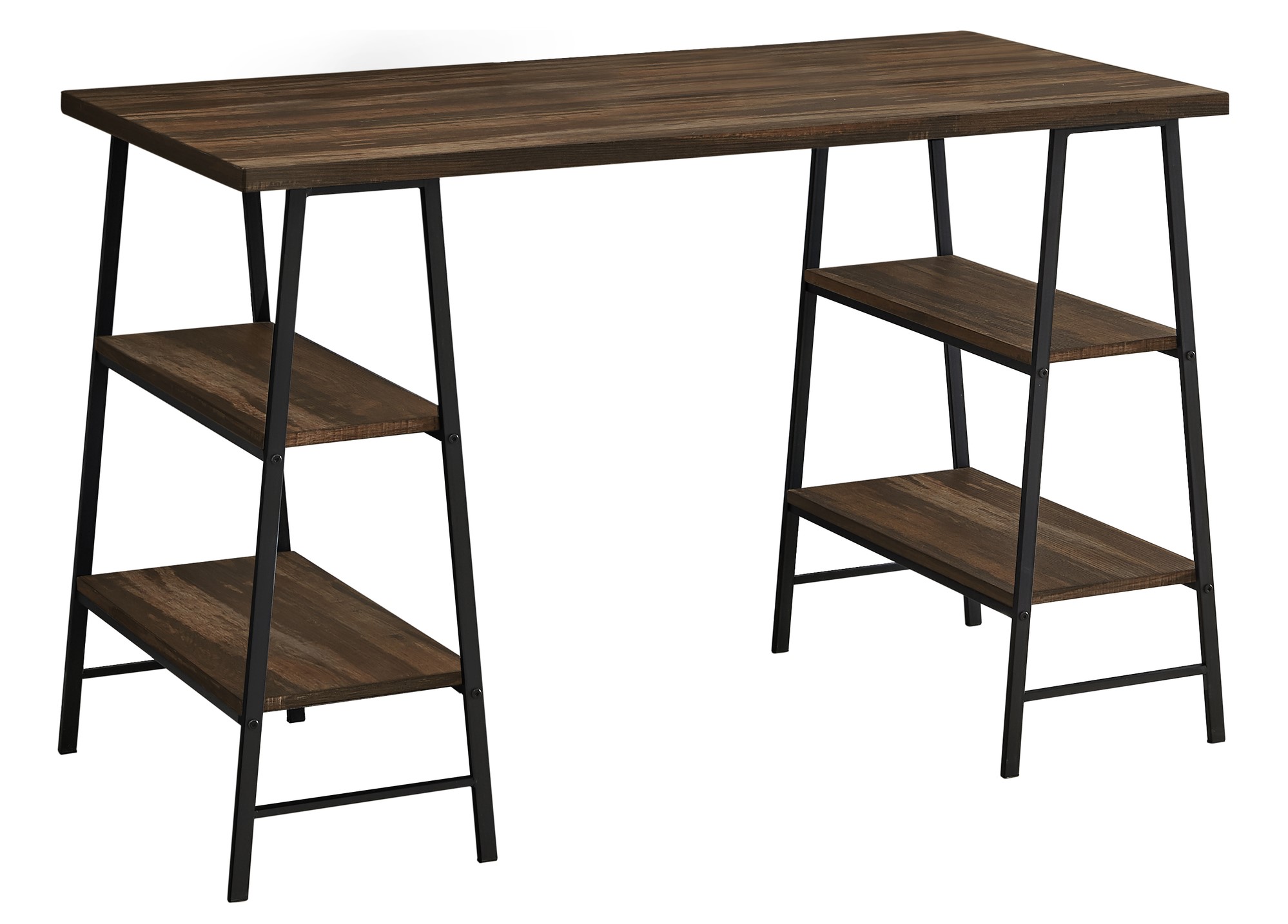 Make your computer desk work as hard as you do. This desk delivers style and functionality from top to bottom, starting with its thick and spacious desktop in a brown reclaimed wood-look finish. Sawhorse-style legs in black metal are put to work as supports for 4 open shelves that can be used to display books, small storage boxes, or other items. The unique, compact design of this industrial-style writing desk maximizes space and storage potential so that you can maximize productivity.