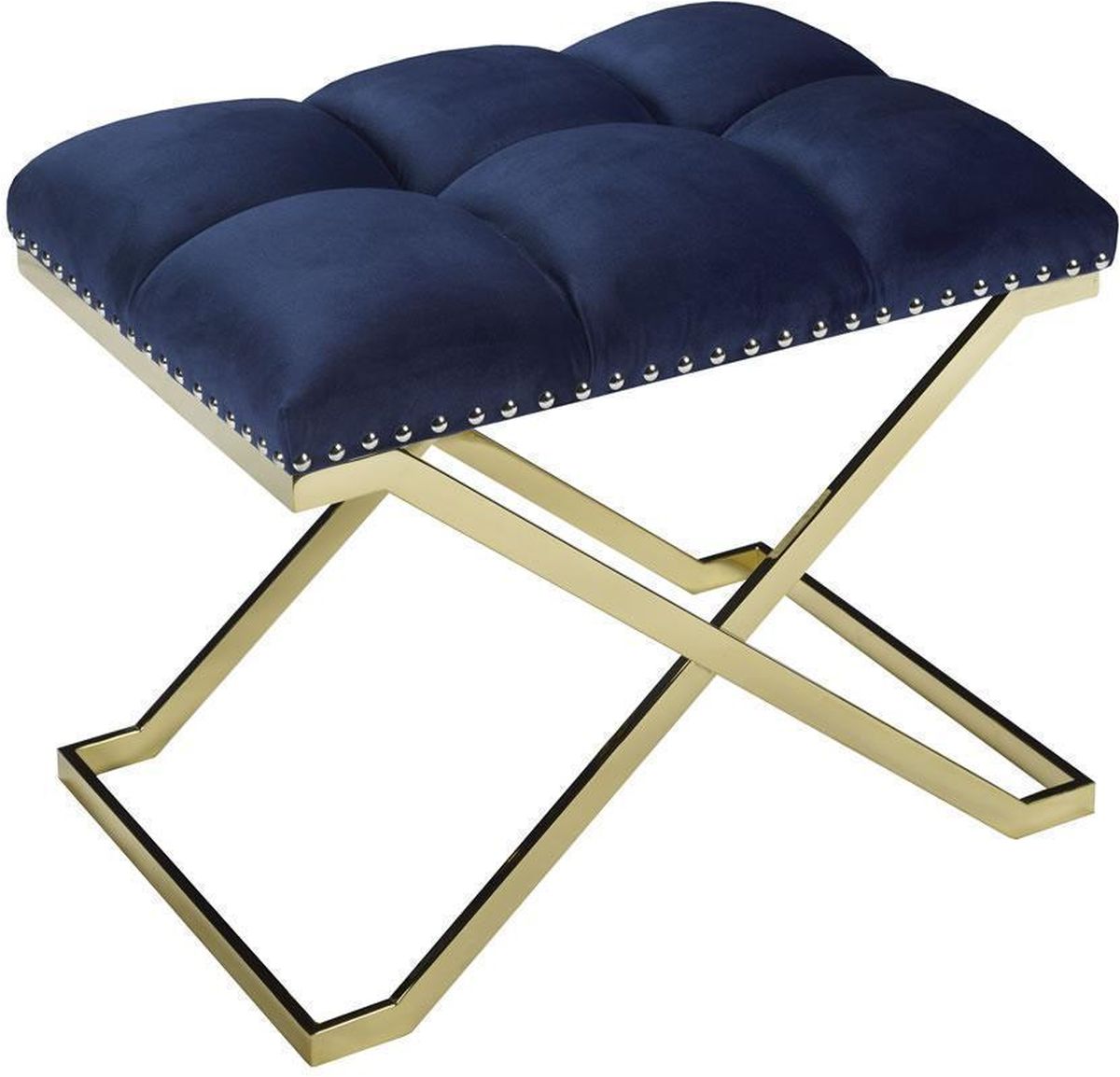 Le siège coussiné touffeté avec des garnitures détaillées en tête de clou sur les côtés repose sur une base en acier inoxydable de couleur dorée.