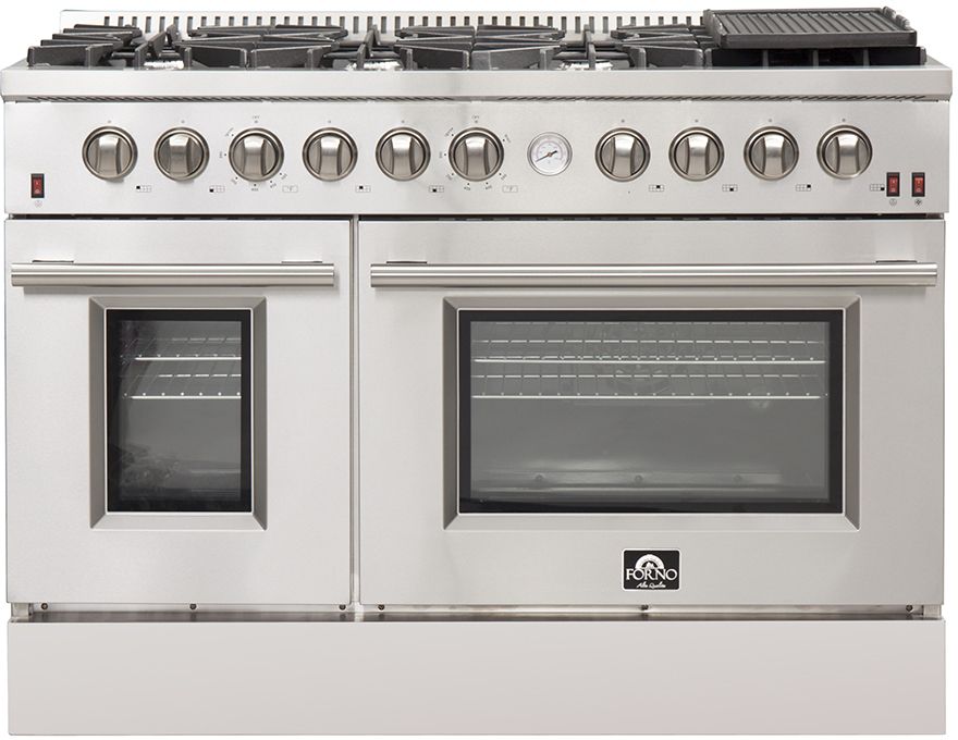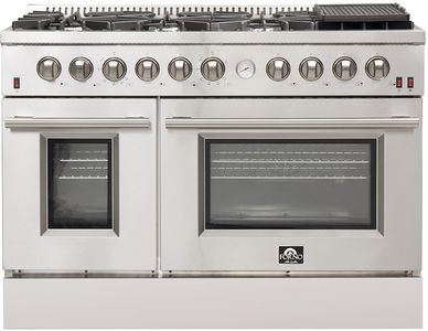 La cuisinière à gaz Forno Massimo 48 po harmonise le style professionnel et la durabilité de l'acier inoxydable 304. Ses 8 brûleurs scellés, totalisant 107 000 BTU, comprennent un brûleur de précision à double anneau de 20 000 BTU qui peut mijoter à 1 000 BTU. Les grilles continues en fonte assurent la stabilité de la surface émaillée. Le four principal d'une capacité de 4,32 pi³ est doté d'un ventilateur de convection et d'une puissance totale de 30 000 BTU pour la cuisson et le gril.Read More