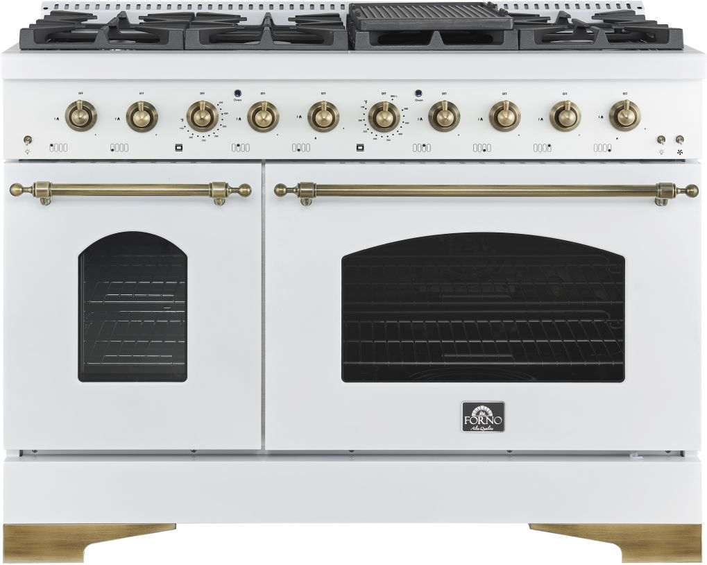 Sublimez votre cuisine avec le four Forno Antico, élégant et performant. 48" Cuisinière à gaz blanche, conçue pour apporter élégance, fonctionnalité et accessibilité à votre cuisine. Dotée de 8 brûleurs scellés et d'une puissance totale de 94 000 BTU, elle offre la puissance et la précision nécessaires pour relever tous les défis culinaires. Les deux brûleurs à double couronne en laiton offrent jusqu'à 20 000 BTU pour saisir à feu vif et 1 000 BTU pour mijoter, assurant un contrôle exceptionnel. Son four à convection de 99 litres (3,5 pi³), complété par un four traditionnel de 57 litres (2 pi³), offre un espace généreux pour les repas de famille. Avec son élégante finition blanche et ses accents en laiton antique, l'Antico respire le raffinement, tandis que ses grilles en fonte garantissent une stabilité et une durabilité à toute épreuve. La plaque de cuisson encastrée en émail facilite le nettoyage, alliant style et praticité. Que vous prépariez un dîner en semaine ou receviez des invités, l'Antico offre la polyvalence et la puissance nécessaires pour tout gérer, tout en sublimant votre cuisine.Read More