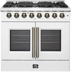 La cuisinière Forno 36" Galiano à double combustible et à portes françaises allie un design intemporel à des performances exceptionnelles. Avec sa finition blanche éclatante et ses boutons en laiton vieilli, elle apporte une touche d'élégance à toute cuisine, à un prix abordable. La table de cuisson est équipée de six brûleurs scellés d'une puissance totale de 83 000 BTU, dont un brûleur double couronne de 20 000 BTU, idéal pour faire bouillir, saisir ou mijoter des sauces délicates. Les grilles robustes en fonte offrent une surface stable et permettent de faire glisser les ustensiles de cuisine sans effort. Son foyer spacieux de 5,36 pouces (13,7 cm) offre un espace généreux pour les aliments. cu.ftLe four à convection véritable assure une répartition homogène de la chaleur grâce à sa puissance de 6 300 watts, pour des plats parfaitement cuits et rôtis. Son intérieur en émail noir facile à nettoyer, sa porte à la française pratique et ses grilles électroplaquées incluses rendent cette cuisinière aussi fonctionnelle qu'esthétique. Fournie avec un kit de conversion au propane et un cordon d'alimentation NEMA 14-50, la cuisinière Galiano allie style et efficacité.Read More