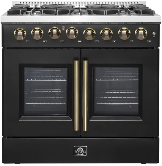 La cuisinière Forno 36" Galiano à double combustible et à portes françaises allie un design intemporel à des performances exceptionnelles. Avec sa finition noire élégante et ses boutons en laiton vieilli, elle apporte une touche de sophistication à toute cuisine à un prix abordable. La table de cuisson est équipée de six brûleurs scellés d'une puissance totale de 83 000 BTU, dont un brûleur double couronne de 20 000 BTU, idéal pour faire bouillir, saisir ou mijoter des sauces délicates. Les grilles robustes en fonte offrent une surface stable et permettent de faire glisser les ustensiles de cuisine sans effort. Son foyer spacieux de 5,36 pouces (13,7 cm) offre un espace généreux pour les aliments. cu.ftLe four à convection véritable assure une répartition homogène de la chaleur grâce à sa puissance de 6 300 watts, pour des plats parfaitement cuits et rôtis. Son intérieur en émail noir facile à nettoyer, sa porte à la française pratique et ses grilles électroplaquées incluses rendent cette cuisinière aussi fonctionnelle qu'esthétique. Fournie avec un kit de conversion au propane et un cordon d'alimentation NEMA 14-50, la cuisinière Galiano allie style et efficacité.Read More