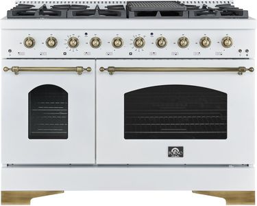 Apportez style et puissance à votre cuisine avec le Forno Antico 48" Cuisinière mixte blanche : l’élégance au service de la performance. Dotée de 8 brûleurs scellés et d’une puissance totale de 94 000 BTU, elle offre la puissance et la précision nécessaires pour relever tous les défis culinaires. Les deux brûleurs à double couronne en laiton fournissent jusqu’à 20 000 BTU pour saisir à feu vif et 1 000 BTU pour mijoter, offrant ainsi un contrôle exceptionnel. Son compartiment de 3,5 pouces cu.ft. un four à convection et 2 autres cu.ftCe four offre un espace généreux pour les repas de famille. Son élégante finition blanche rehaussée de détails en laiton vieilli lui confère un style raffiné, tandis que ses grilles en fonte garantissent stabilité et durabilité. La plaque de cuisson en émail encastrée facilite le nettoyage. Cette cuisinière allie harmonieusement puissance, style et fiabilité pour une expérience culinaire exceptionnelle, le tout à un prix abordable.Read More