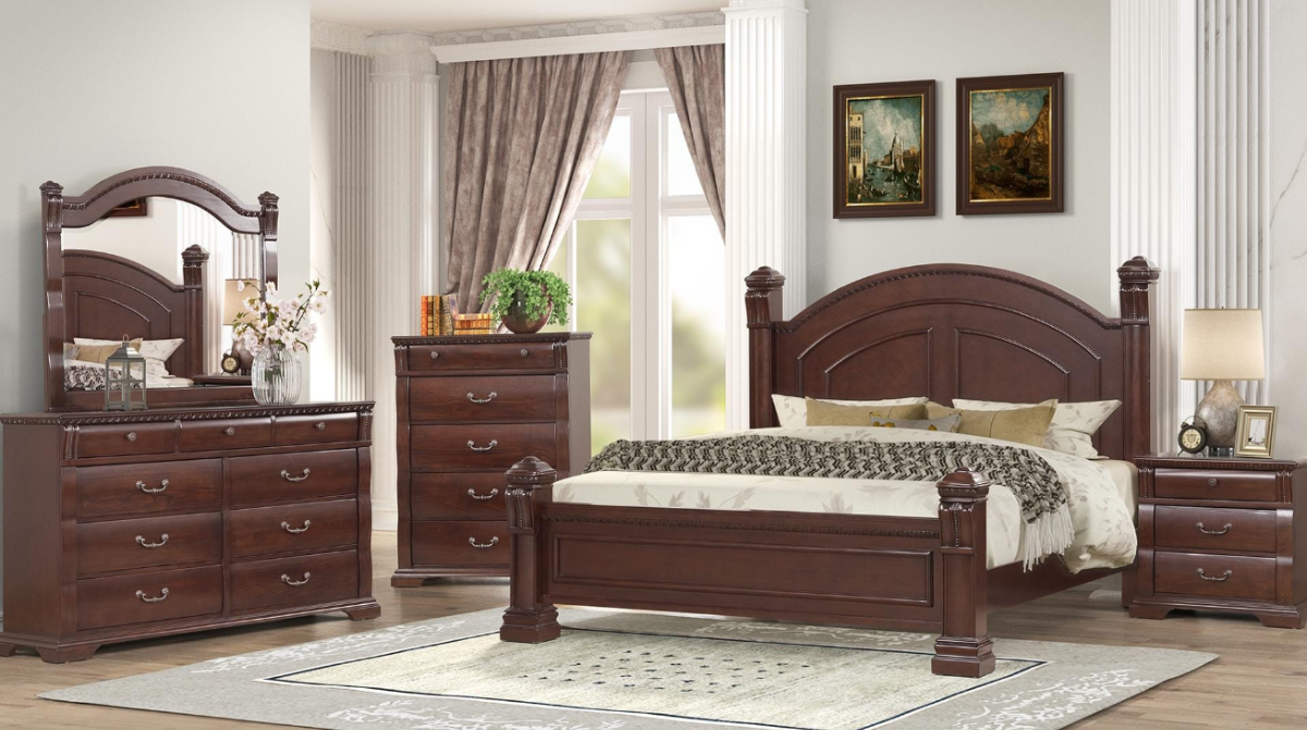 Ensemble de chambre à coucher disponible en Queen et King 1 lit, 1 bureau, 1 mirroir et 2 tables de nuits Extra Commode Couleur: brun foncé Matériel : boisRead More