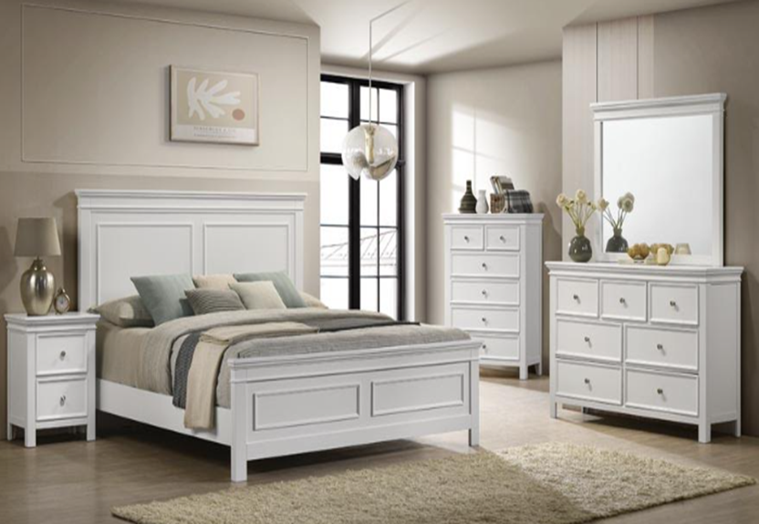 Ensemble de chambre à coucher disponible en Queen et King 1 lit, 1 bureau, 1 mirroir et 2 tables de nuits Extra commode Couleur: blanc Materiel : BoisRead More