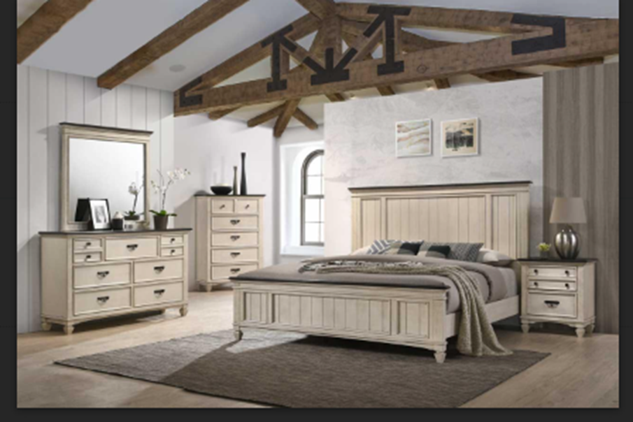 Ensemble de chambre à coucher disponible en Queen et King 1 lit, 1 bureau, 1 mirroir et 2 tables de nuits extra commode Couleur: crème avec le dessus noir Materiel : BOISRead More