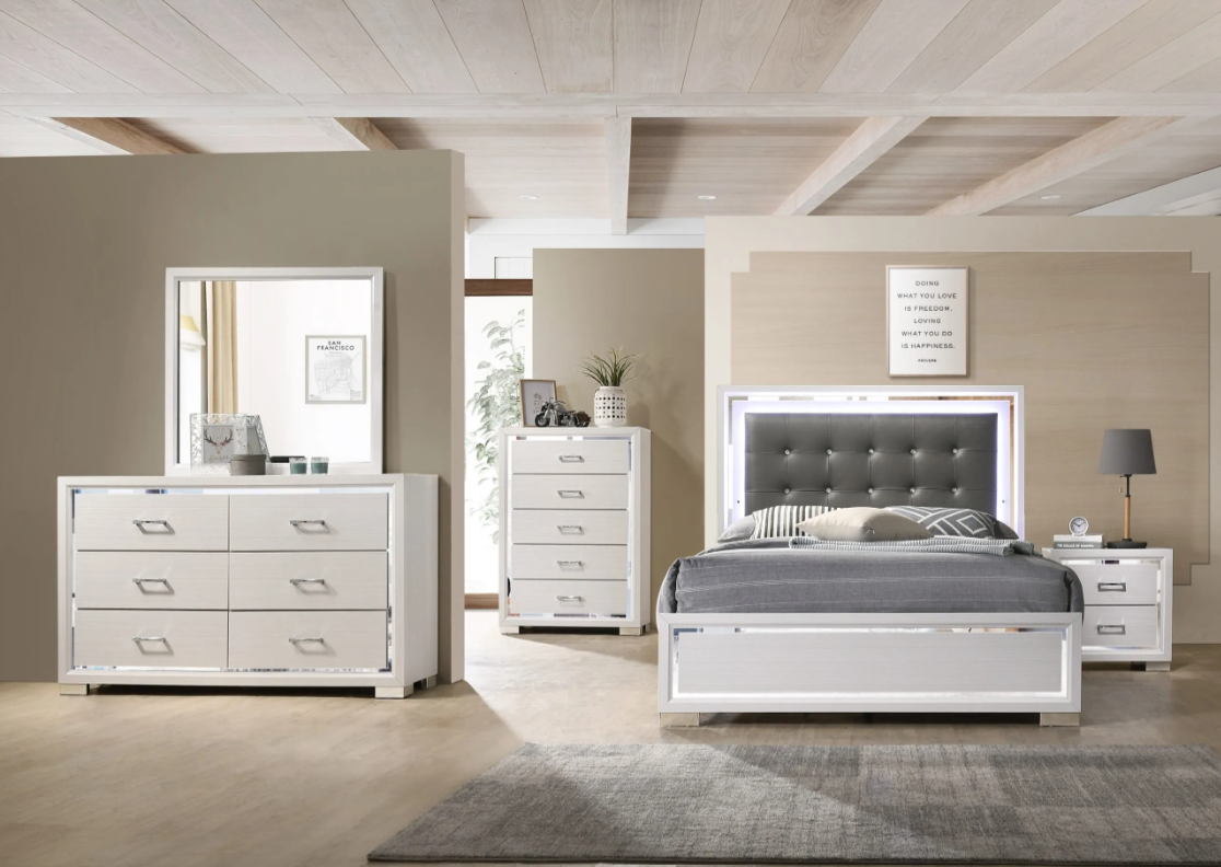 Ensemble de chambre à coucher Grand (Queen) Tres grand (King). L'ensemble comprend 1 lit, 1 bureau, 1 mirroir et 2 tables de nuits. Vous pouvez compléter votre chambre avec une commode en supplément Couleur: Blanc Matériel : Bois avec tête de lit en simili cuir gris.Read More