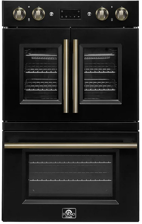 Le four mural double Forno Asti de 30" en noir avec accessoires en laiton antique allie élégance et performance avec un four supérieur à porte française pour un accès sans effort d'une seule main. Doté de 7,36 pieds cubes de véritable cuisson par convection, il assure une répartition uniforme de la chaleur pour des résultats de cuisson parfaits. La fonction de friture à l'air intégrée offre des textures croustillantes avec un minimum d'huile, tandis que les boutons de commande de précision offrent une approche pratique de la cuisson. Un écran numérique à LED offre une gestion transparente de la minuterie et de la fonction Sous Vide. améliorant la précision et la polyvalence Conçu pour plus de commodité, le mode autonettoyant simplifie l'entretien, gardant votre four impeccable avec un minimum d'effort.Read More