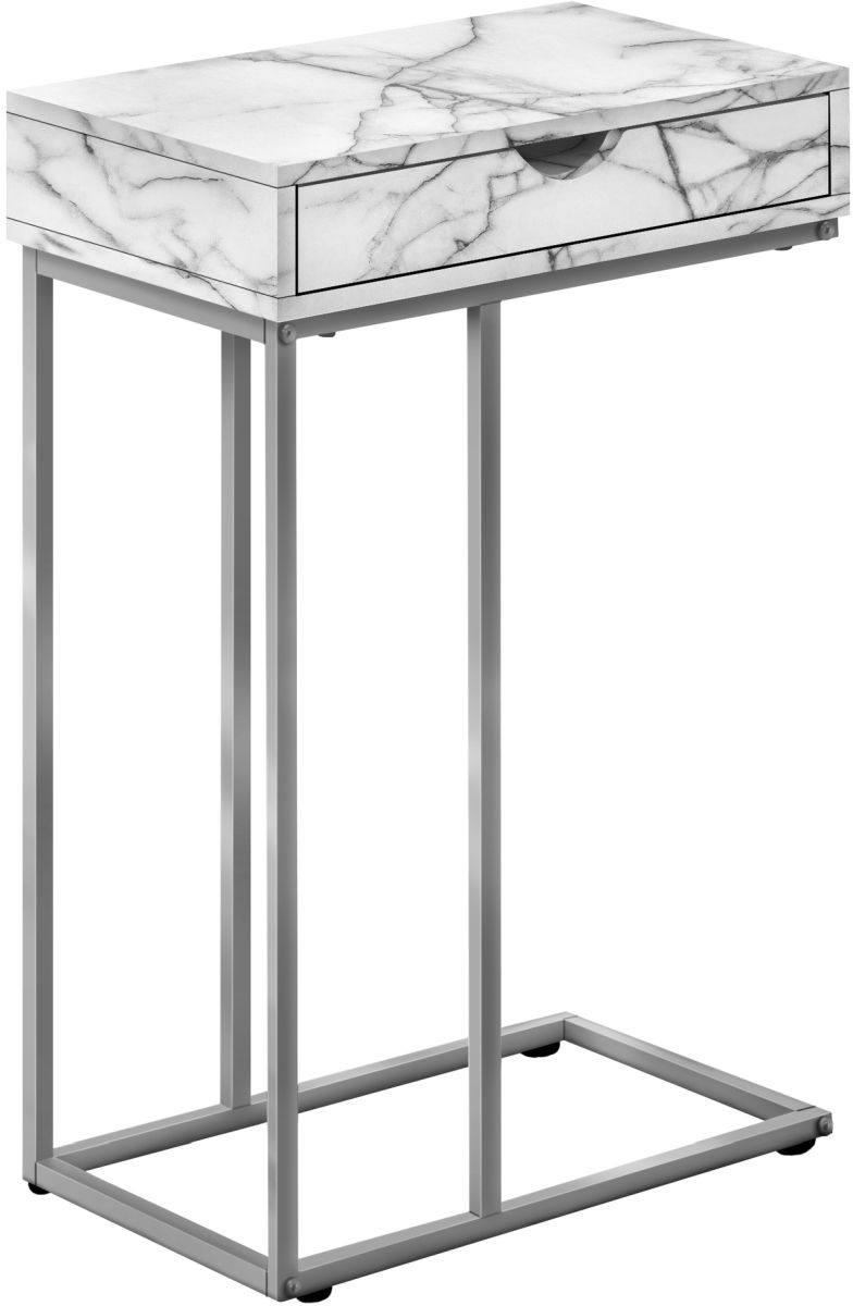 Vous en avez assez de tenir une boisson à la main et un bol de pop-corn sur vos genoux lorsque vous regardez un film ? Cette table en C les garde à portée de main pour que vous puissiez vous asseoir et profiter du spectacle. La base en forme de C se glisse sous votre canapé ou votre fauteuil, plaçant la surface de la table près de vous. Pour plus de commodité, le dessus comprend un tiroir de rangement accessible des deux côtés. Utilisez-le pour cacher vos appareils mobiles afin d'éviter les interruptions pendant que vous regardez la télévision, puis rangez-y les télécommandes lorsque vous avez terminé. Élégante et polyvalente, cette table d'appoint portable est dotée d'un plateau en finition stratifiée lisse aspect marbre blanc et d'un cadre métallique en argent qui ajoute un look moderne partout où vous avez besoin d'une petite table d'appoint avec rangement.Read More